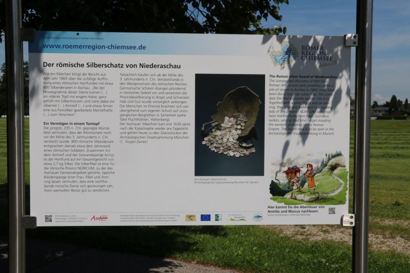 Im Bereich von Aschau sind drei Stellen vorgesehen, „an denen man die Römer noch hautnah erleben kann“; die Schautafel über den spektakulären Silberschatz war die erste Präsentation. Sie erinnert an den Hortfund, ein „Fernrohr“ lenkt den Blick auf den Fundort des Schatzes, eine Tafel liefert die nötigen Informationen. Dr. Cordula Nagler-Zanier vom Arbeitskreis Römerregion Chiemsee im Heimat- und Geschichtsverein (HGV) Aschau stellte den Text zusammen. Vorgesehen und in Vorbereitung sind noch eine Tafel im Kurpark über Prähistorische Funde in und um Aschau und eine weitere in Höhenberg mit dem Blick zu Fluchthöhlen in der Region. Diese Tafeln sollen in den nächsten Monaten aufgestellt werden.
