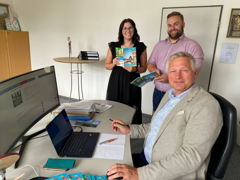 Bericht: Markt Bruckmühl – Foto: Mischi – Bürgermeister Richard Richter (rechts) checkt online die Angebote des Bruckmühler Ferienprogramms. Die neue Koordinatorin Lisa Brossmann (links) und Jugendreferent Christian Kastel (Mitte) freuen sich über das vielfältige Angebot 2023 und die enorme Einsatzbereitschaft der Vereine.