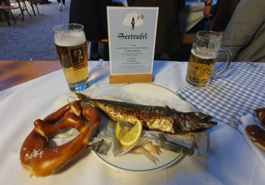 Es war wieder soweit, frisch gegrillter Steckerlfisch, typisch bayrisch, traditionell im Biergarten des Zollpackhofs. Es ist ursprünglich eine Spezialität aus dem Alpenvorland. Jedoch steht diese Kulinarität inzwischen auch in Biergärten nördlich des Weißwurstäquators auf der Speisekarte.