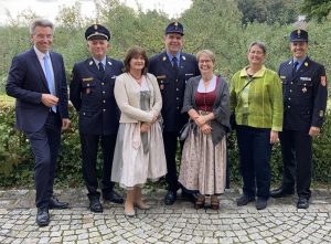 (von links) Landrat Otto Lederer, Kreisbrandmeister Hermann Kratz und Ehefrau Marlies Kratz, Kreisbrandinspektor Franz Hochhäuser und Ehefrau Christine Hochhäuser, Bettina Bauer Leiterin der Abteilung Öffentliche Sicherheit und Ordnung, Ausländerrecht, Verkehrswesen im Landratsamt Rosenheim, Kreisbrandrat Richard Schrank.