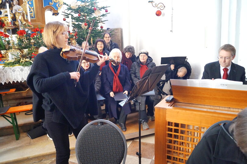 Kirchenmusiker Kristian Aleksic begleitete auch den, vom Volk, dem Chor und den Musikern gemeinsam musizierten Choral „O du fröhliche“ auf der großen Orgel auf der Empore. Einer der Höhepunkte kam auch von Sarah Emmert, Violine und Ralf Halk, Truhenorgel, die nach der Lesung virtuos den dritten Satz aus dem Konzert für Orgel und Violine in d-Moll von Antonio Vivaldi vortrugen. Mit der andächtigen Méditation aus Thaïs von Jules Massenet begleiteten sie die Gläubigen bei der Kommunion.