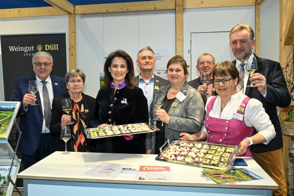 Nach zwei Jahren Coronapause präsentiert sich der Freistaat Bayern in diesem Jahr wieder auf der Internationalen Grünen Woche in Berlin als Urlaubsland und Land der Genüsse. In der großen Bayernhalle – seit vielen Jahren der Besuchermagnet schlechthin – zeigen über 50 Aussteller den Besucherinnen und Besuchern, was der Süden Deutschlands an kulinarischen Spezialitäten und an Gastfreundschaft zu bieten hat. Auch der Tourismusverband Steigerwald ist dabei und präsentiert die Urlaubs- und Genussregion im Herzen Frankens. Unter anderem mit dem Weingut Düll aus Ipsheim. Bei ihrem Rundgang durch die Bayernhalle hat auch Agrarministerin Michaela Kaniber am Stand des Tourismusverbands Steigerwald vorbeigeschaut und einen Frankenwein probiert. Dabei zeigte sie sich beeindruckt von den vielfältigen touristischen Angeboten des Steigerwalds.