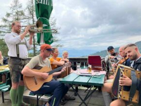 ♫♪ Volksmusik im Gebirge – Musikseminar am Fuße des Dachsteins  – Die achte Ausgabe von Volksmusik im Gebirge findet heuer erstmal im Gasthof Hunerkogel statt – wunderschön vor der Dachstein-Südwand gelegen, mit atemberaubendem Rundum-Panorama und Gletscherbahnanschluss direkt neben der Tür. Auf der Terrasse und im Gasthof wird musiziert bis sich die Balken biegen: Neben Harmonika, Hackbrett und Gitarre werden viele weitere Instrumente unterrichtet, die in der alpenländischen Volksmusik gut einsetzbar sind. Tagsüber Einzelunterricht, dazu einmal eine Stunde Gruppenunterricht, an jedem Abend wird offen musiziert.