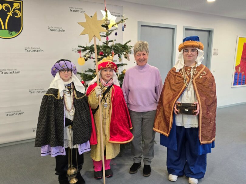 Bericht und Foto: Agnes Giesbrecht, Pressereferentin der Großen Kreisstadt Traunstein – Caspar, Melchior und Balthasar bringen den Menschen im Rathaus Glück und Segen für das neue Jahr. Zweite Bürgermeisterin Burgi Mörtl-Körner freute sich über die Segenswünsche der Heiligen Drei Könige. Foto: Sophia Haßlberger/Stadt Traunstein