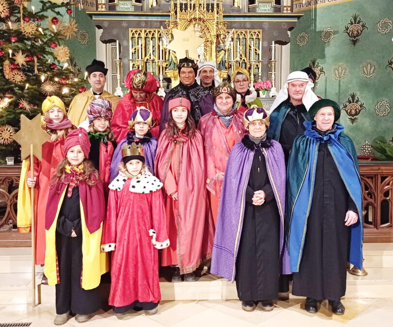 Bericht und Bilder: Christiane Giesen – Foto zeigt viele der ausgesandten Sternsinger mit Pfarrer Konrad Roider und Burgi Häckel (oben links) vor dem Altar der Pfarrkirche St. Nikolaus.