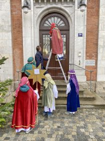 Es ist und bleibt -auch und gerade in Corona-Zeiten- Tradition, dass die Sternsinger zu Jahresbeginn das Rosenheimer Rathaus besuchen und beehren. Auch wenn 2. Bürgermeister Daniel Artmann die farbenfrohe Sternsingerschar von St. Nikolaus pandemiebedingt nur unter freiem Himmel vor dem Rathaus empfangen konnte. Dafür prangt der Segensspruch der Sternsinger jetzt ganz oben an der historischen Eingangstür des Rathauses.