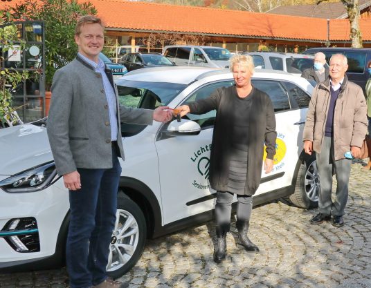 Der Aschauer Helferkreis hat ein zweites Fahrzeug für die Aschauer Senioren erhalten. Die Stiftung LichtBlick Seniorenhilfe München stellte der Gemeinde Aschau als spontane Unterstützung der mustergültigen Aschauer Seniorenarbeit 40000 Euro für einen KIA e-Niro zur Verfügung. Die Vorstandsvorsitzende der „Stiftung Lichtblick Seniorenhilfe“ Lydia Staltner übergab die Schlüssel des nagelneuen Fahrzeugs an Bürgermeister Simon Frank, der sie umgehend an den Seniorenbeauftragten Philipp Ramming weiter reichte. Sie wünschte den Aschauer Senioren im neuen E-Auto allzeit gute Fahrt: „Mit diesem neuen Auto kann man vielen alten Leuten etwas Gutes tun“. Bürgermeister Frank bedankte sich für die unbürokratische Hilfe der Stiftung. Das neue Auto sei eine willkommene Unterstützung für den bisherigen Aschauer Seniorenbus, der seit drei Jahren in der Region für und mit Aschauer Senioren im Einsatz ist. Alleine im vergangenen Jahr wurden 1307 Männer und Frauen aus Aschau befördert. Da aber die Fahrziele zum Teil weit auseinander lagen, gab es große Überschneidungen und entsprechende Wartezeiten. Die Verantwortlichen des Aschauer Helferkreises sahen die Notwendigkeit eines zweiten Fahrzeugs, denn zum Teil wurden durch den AHK auch private Fahrzeuge eingesetzt, um die Anforderungen aus der Bevölkerung abarbeiten zu können.