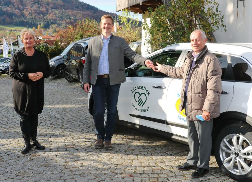 Beitrag und Bilder: Heinrich Rehberg – Die Vorstandsvorsitzende der „Stiftung Lichtblick Seniorenhilfe“ Lydia Staltner übergab die Schlüssel des nagelneuen Fahrzeugs an Bürgermeister Simon Frank (links), der sie umgehend an den Aschauer Seniorenbeauftragten Philipp Ramming (rechts) weiter reichte.