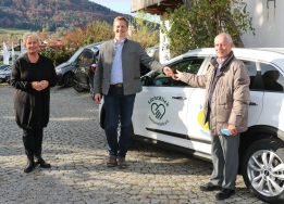- Die Vorstandsvorsitzende der „Stiftung Lichtblick Seniorenhilfe“ Lydia Staltner übergab die Schlüssel des nagelneuen Fahrzeugs an Bürgermeister Simon Frank (Mitte), der sie umgehend an den Aschauer Seniorenbeauftragten Philipp Ramming (rechts) weiter reichte.