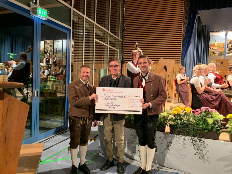 Für die Paula Schamberger Stiftung mit Sitz am Samerberg konnte bei den jüngsten Konzerten in der Samer Halle Bürgermeister Georg Huber eine Spende in Höhe von 2.000 Euro an die Musikkapelle Samerberg übergeben. „Der Zweck der Stiftung ist unter anderem die Förderung der Bildung und Erziehung, deswegen passt diese Spende für die örtliche Blasmusik ganz gut“, so Bürgermeister Huber bei der Übergabe an Dirigent Benedikt Paul und an Musik-Vorstand Michael Daxer. Die beiden Samerberger Blasmusik-Verantwortlichen bedankten sich ganz herzlich für die Spende und sie sagten zu, dass diese in erster Linie der Jugendarbeit zugute kommen wird. „Aktuell befinden sich 35 Kinder und Jugendliche in musikalischer Ausbildung am Samerberg und 28 spielen derzeit in unserer Jugendkapelle unter der Leitung von Sebastian Denzler“ – so Michael Daxer bei der Entgegennahme der noblen Spende.