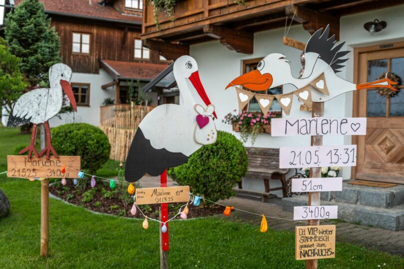 Der Brauch, zur Geburt eines Kindes einen Storch aufzustellen, ist in vielen Regionen Bayerns fest verwurzelt. Ursprünglich stammt er aus der ländlichen Überzeugung, der Storch bringe das Kind – was lag also näher, als ihn auch öffentlich als Überbringer der frohen Botschaft zu präsentieren? Mit viel Liebe zum Detail und einem Augenzwinkern werden die gefiederten Gratulanten meist von Freunden, Familie oder sogar dem Stammtisch aufgestellt – so auch hier in Grainbach, wo sich die “VIP-Weiber” des örtlichen Stammtischs kreativ ausgetobt haben. „Da VIP-Weiber Stammtisch gratuliert zum Nachwuchs“, heißt es auf einem der Schilder – und spätestens da wissen auch alle Passanten: Hier ist die Freude groß und der Humor ungebrochen. Die drei Störche, unterschiedlich gestaltet und alle mit Infos zur kleinen Marlene versehen, wachen nun stolz über den Vorgarten und zaubern so manchem Vorbeikommenden ein Lächeln ins Gesicht.