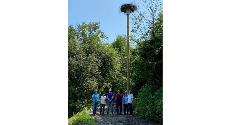 Bildunterschrift: Freuen sich über das in guter Zusammenarbeit entstandene neue Zuhause für Weißstörche – v.l.n.r.: Stefan Schmidt vom städtischen Umwelt- und Grünflächenamt; Naturschutzwächterin Katharina Schlegl-Kofler und die Vertreter der unterstützenden Unternehmen Lucas Radisch, Beton Bernrieder; Stephan Pross, Metallbau Pross; Martin Mayer sen. und Thomas Mayer jun., Eisen Mayer
