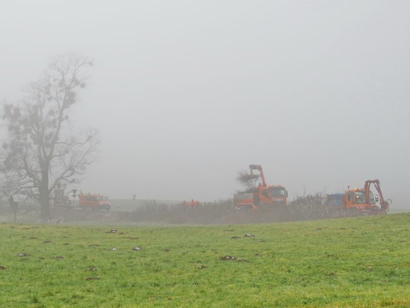 Ob Baumfällungen oder das Herrichten der Straßen – das sind immer wiederkehrende Aufgaben des Staatlichen Straßenbauamtes. Unsere Aufnahme an einem nebligen Tag zeigt einen Einsatztrupp bei seinen Sicherungs- und Säuberungsmaßnahmen auf der Staatsstraße zwischen Wildenwart und Frasdorf.