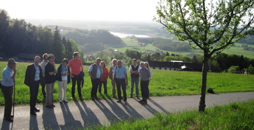 Bericht und Foto: Inge Graichen, Öffentlichkeitsarbeitsverantwortliche der Streuobstinitiative Chiemgau und der Leader-AG Chiemgauer-Seenplatte – Bildunterschrift: Zweiter Vorsitzender Josef Stein (4. von rechts) zeigte den Mitgliedern der Streuobstinitiative Chiemgau den Obst- und Kulturweg Ratzinger Höhe, der beeindruckende Ausblicke liefert und dem Betrachter den Wert der heimischen Obstanger nahebringt