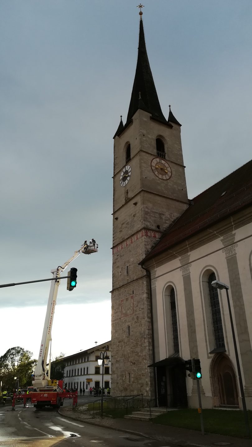 Aktuell begutachtet der Fachstatiker den Kirchturm in Halfing. Hier sehen Sie den Kirchturm. Im oberen Drittel sehen Sie einen leichten Knick nach rechts. Dieser Knick und der komplette Kirchturm werden nun von dem Fachstatiker begutachtet.