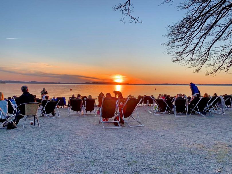 In der Feldwieser Bucht bei Übersee in der dortigen Strandanlage treffen sich in diesen sonnigen Osterferientagen ganze Scharen von Leuten, die sich am Chiemsee-Ufer, am stimmungsvollen Sonnenuntergang und an exotischen Getränken erfreuen. “Damit erhalten wir in unserer Chiemgauer Heimat eine Stimmung, die ansonsten in weiter Ferne nur zu bekommen ist” – so ein Priener Stammgast, der vom westlichen Chiemsee-Ufer immer wieder zur Julius-Exter-Strandpromenande und an die dortige Beach-Bar und an den Strand mit seinen vielen Liegen zum Entspannen fährt.