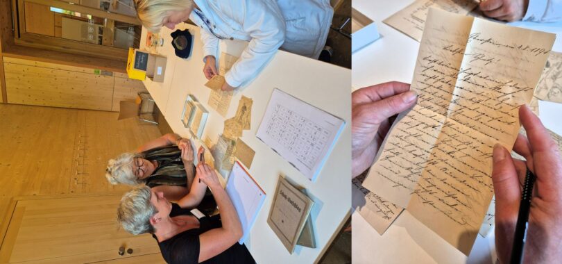 –Barbara Sailer, Karin Silmbrod und Renate Engelhardt beim Entziffern von Briefen in Sütterlin-Schrift. (von links nach rechts)