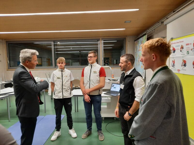 Aber auch in anderen Bereichen gab es an diesem Abend an der Wirtschaftsschule viel zu entdecken. Gleich im Eingangsbereich boten die Sport-Lehrkräfte einen Sportparcours zum Mitmachen an. Im Keller gaben die Schulsanitäter einen Einblick in ihre verantwortungsvolle Arbeit, einen „Rausch-Parcour“, bei dem man hautnah erfahren konnte, wie die Sinne im wahrsten Wortsinn mit zunehmendem Alkoholpegel vernebelt werden, hatte die kommunale Jugendarbeiterin aufgebaut und das Catering-Team servierte mit ihrem „Flying Buffet“ den ganzen Abend kulinarische Köstlichkeiten. Die Tutorinnen und Tutoren standen während der gesamten Veranstaltung für Schulhausführungen bereit. Sämtliche Lehrkräfte der Wirtschaftsschule waren vor Ort und boten in ihren Räumen Informationen zu den verschiedenen Fächern dieses Schultyps, aber auch die Beratung zum Übertritt aus anderen Schulen oder zu schulischen und persönlichen Problemfällen kam nicht zu kurz. Eine vor Ort durchgeführte Umfrage des Publikums ergab, dass die meisten Besucherinnen und Besucher aufgrund des ausgesprochen guten Rufs, den die Wirtschaftsschule Alpenland in der Region genießt, eine Anmeldung ihrer Kinder an dieser Schule in Erwägung ziehen.