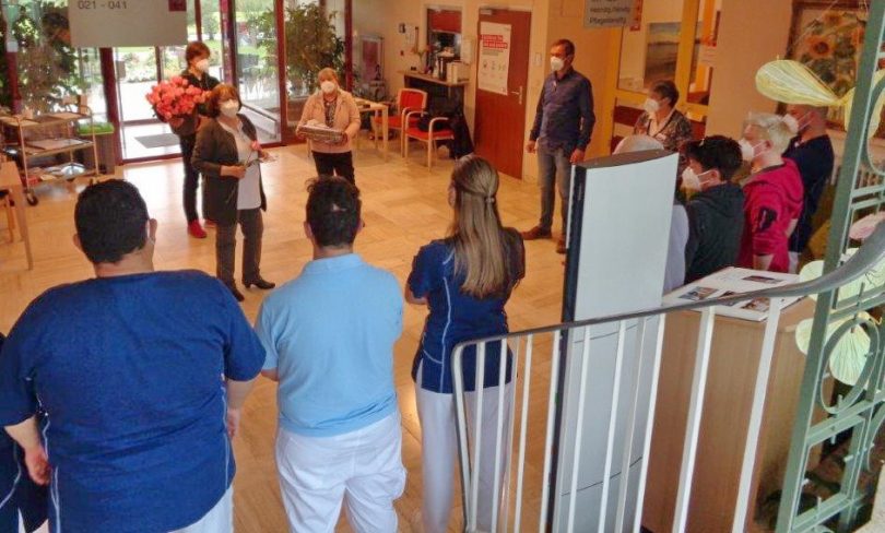 Foto: Altenheim St. Josef in Prien – von links: Thomas Ganter, Regina Seipel, Christa Barhainski vom Priener Pfarrgemeinderat und Peter Riedel, Pflegedienstleiter in St. Josef, MitarbeiterInnen aus Pflege, Beschäftigung, Hauswirtschaft und Hausmeisterei.