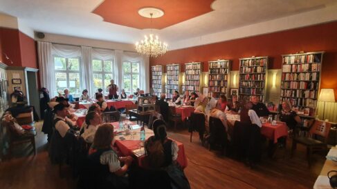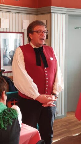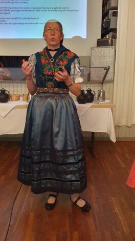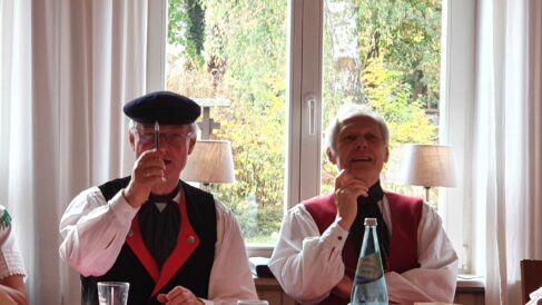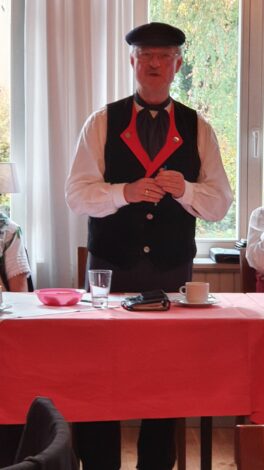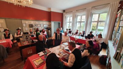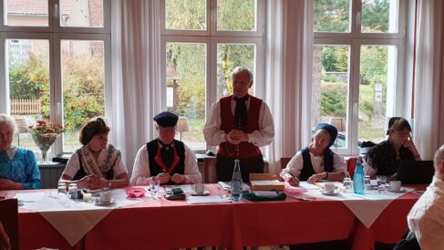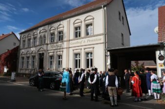 Die diesjährige Jahreshauptversammlung des Mitteldeutschen Heimat- und Trachtenverbandes fand in Rädigke, im Hohen Fläming des Landes Brandenburg statt. Wie jedes Jahr traf man sich am 3. Sonntag im Oktober, dem bundesweit geltenden “Tag der Tracht”. Eingeladen waren die Delegierten der 20 Mitgliedsvereine in das historische Gasthaus Moritz. Der Vorsitzende des Trachtenverbandes, Charles Koppehele, hieß die Trachtler*innen aus Berlin, Brandenburg, Sachsen und Sachsen-Anhalt in ihren vielfältigen Trachten auf das Herzlichste willkommen. Einen besonderen Dank richtete er an die Wirtsleute Doris und Bernd Moritz, für die Gastfreundschaft in ihrem historischen Gasthof. Es ist nicht nur ein üblicher Gasthof, sondern auch eine öffentliche Bibliothek, der einzige Bibliotheks-Gasthof in Deutschland. Bernd Moritz zeigte sich erfreut, erstmals so eine Vielfalt der mitteldeutschen Trachten in seinem Hause bewundern zu können. Mit dabei sogar in bayerische Tracht, die Vertreter vom Verein der Bayern in Berlin.