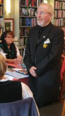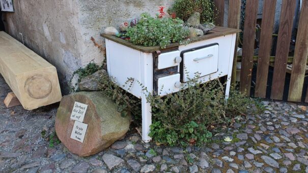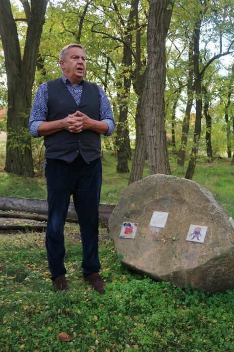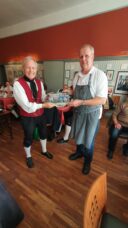 Gestärkt vom deftigen Mittagessen der ländlichen Moritz-Küche ging es dann mit Bernd Fredrich, dem Literaten und Fremdenführer von Rädigke, zu einer Ortsbesichtigung. Fredrich widmet sich mit Leidenschaft den Dichtern der lyrischen Hochkomik. So umrahmte er den Rundgang auch mit humorvollen Gedichten, wie z. Bsp. der Lausbubengeschichte “Max und Moritz” vom Wilhelm Busch. Neben der Besichtigung der historischen Dorfkirche aus dem 13. Jahrhundert führte der Weg u. a. auch entlang des Literaturpfades des Ortes. Auf Kacheln, angebracht auf großen Feldsteinen, findet man Sprüche von bekannten Literaten. Dazu mit den amüsanten literarischen Einlagen von Bernd Fredrich war der Rundgang der Trachtler ein Kunstgenuss der besonderen Art.