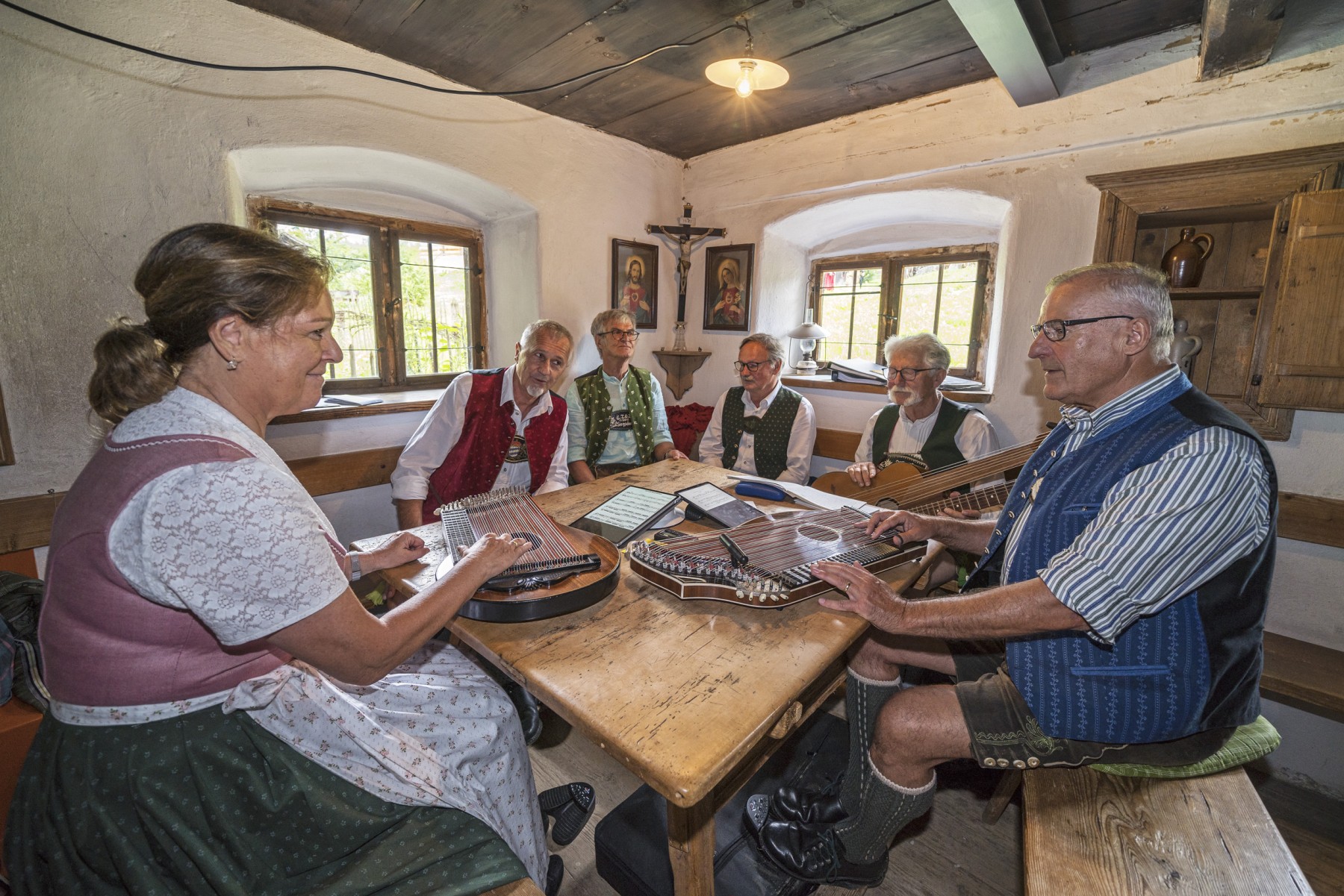 In der intimen Atmosphäre der historischen Stuben spielen und singen die Musikanten und Musikantinnen fürs Publikum auf. Bildquelle: Bezirk Oberbayern, Archiv Freilichtmuseum Glentleiten, Foto: Bäck