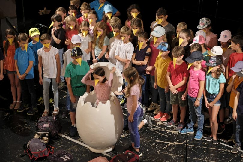 Täglich übten die Drittklässler in unterschiedlichen Räumen. Dabei erfuhren sie, wie intensiv sich Proben gestalten können: Musikexperten wie Stimm-Coaches vermittelten, wie man „richtig“ atmet, eine professionelle Haltung einnimmt und sich kontrolliert bewegt. Die musikalische Begleitung kam vom siebenköpfigen Orchester des Freien Landestheater Bayern. Beide Angebote stellte die Zuckowski-Musikstiftung zur Verfügung. So übten die musikalischen Nachwuchstalente Motive und Szenen aus verschiedenen berühmten Musikstücken ein: Papagenos Auftritt als Vogelfänger aus Mozarts Kinderoper „Die Zauberflöte“, das Küken-Ballett aus Mussorgskys „Bilder einer Ausstellung“, Rossinis „Die diebische Elster“ und den zwitschernden Freund („Der Vogel“) aus „Peter und der Wolf“ von Sergej Prokofjew.