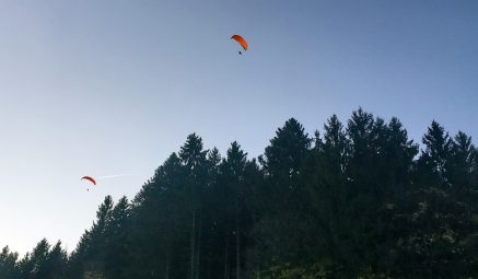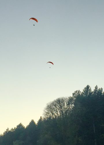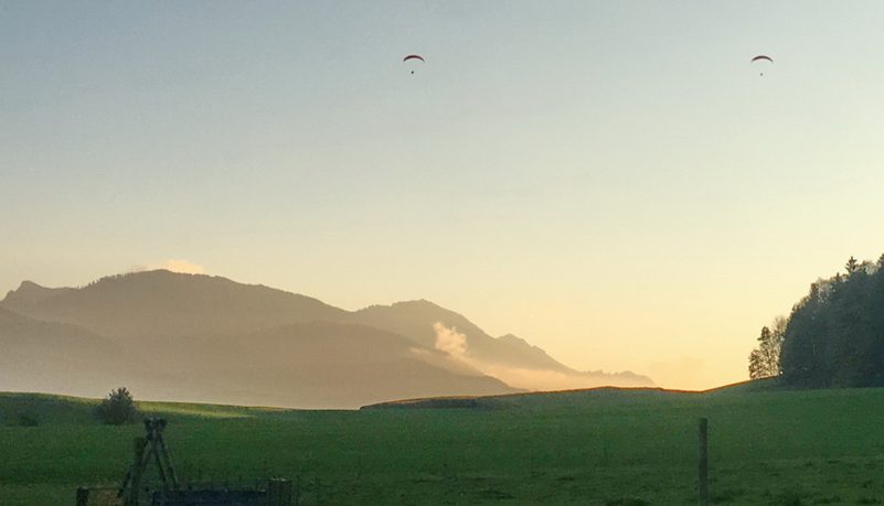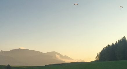 Selten, aber bestimmt reizvoll ist das Gleitschirmfliegen mit Motor und noch rarer ist der Anblick, dass zwei Motorschirmflieger sozusagen im Tandem einherfliegen. Unsere aktuellen Aufnahmen entstanden in Prien-Prutdorf als zur untergehenden Sonne die beiden Motorschirmflieger noch aufbrachen, um sich Landschaft und Natur von oben anzusehen.