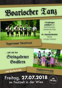 Am Freitag, 27. Juli veranstaltet der Trachtenverein „Oberlandler“ Wies, im Rahmen des 91. Gautrachtenfestes des Oberen Lechgau-Verbandes einen Boarischen Tanz. Das ist ein ganz besonderer Höhepunkt für alle Tanzbegeisterten und Liebhaber guter, handgemachter Musik. Die mittlerweile im ganzen Voralpenraum, aus Funk und Fernsehen bekannte Tegernseer Tanzlmusi und die Halbtonmusig aus Stötten am Auerberg spielen ab 20 Uhr fleißig zum Tanz auf und die Steingadener Goaßler sorgen mit ihren Auftritten für gute Stimmung im Festzelt.
