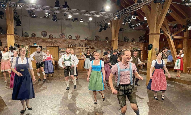Bairisch gewandet hat sich eine tanzfreudige Gruppe im Juli aus Diessen auf den Weg nach Söllhuben gemacht, um bei der Aufzeichnung der Wirtshausmusikanten bairisch Polka zu tanzen. Spitze Hacke Stampf, Spitze Hacke Stampf. Wechselschritt Wechselschritt, Drehen Drehen … Magnus Wortsignale sind vor dem Hirzinger und der letzten Kirche, die Barockbaumeister Johann Michael Fischer (1692-1766), Bauherr des Diessener Marienmünsters seinerzeit gebaut hat, mehrfach im Regen untergegangen. Bevor die Haarprachten vollends zerstört waren, brach Regisseur Thomas Kommayer die Tanzerei auf der Söllnhuber Hauptstraße ab und zeichnete für den Rest des Abends im Wirtshaussaal auf. Da gings lustig zu. Traudi Siferlinger hat die roten Schuhe ausgezogen und übte ihre Geigenmusiken barfuß und Moderator Dominik Glöbl hat sich beim Privattraining mit Magnus Kaindl redlich um die Schrittfolgen der bairisch Polka bemüht. Die Line Dancer aus Diessen begleiten das Intro bei den Wirtshausmusikanten am Sonntag und sind dazwischen auch noch zu sehen und Magnus ist zu hören.