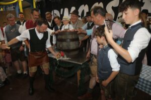 Mit drei wuchtigen Schlägen zapfte Bürgermeister Stefan Haberl das erste Holzfass an, dass zweitgrößten und schönsten im Erdinger Landkreis ist eröffnet