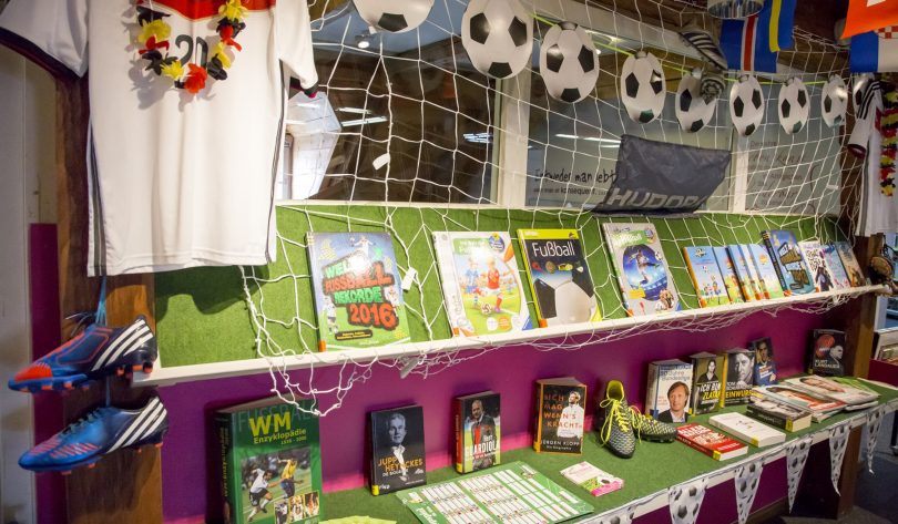 Bericht und Foto: Bücherei Prien – Bildunterschrift: Passend zum Thema Fußball präsentiert die Bücherei in der aktuellen Ausstellung eine Vielzahl an Büchern für Groß und Klein.