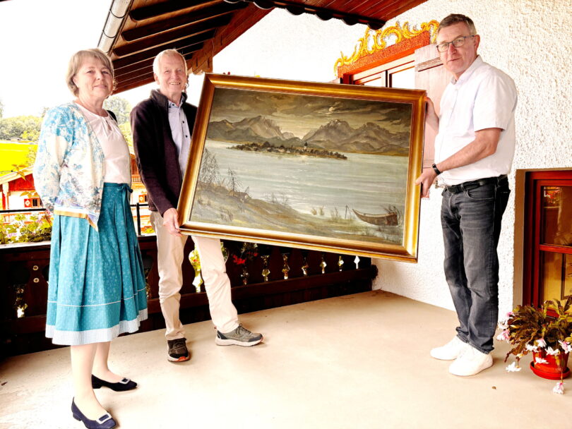 Das Bild zeigt eine eindrucksvolle Ansicht des Chiemsees mit der Fraueninsel im Mittelpunkt, eingerahmt von den Gipfeln der Chiemgauer Alpen im Hintergrund. Bürgermeister Georg Huber nahm das Werk im Rathaus entgegen und dankte der Familie Haefele herzlich für die großzügige Schenkung: „Wir werden einen würdigen Platz dafür finden.“