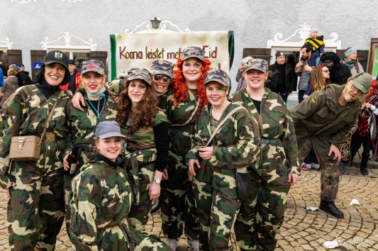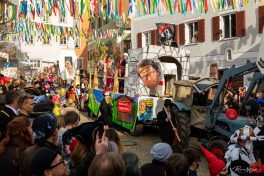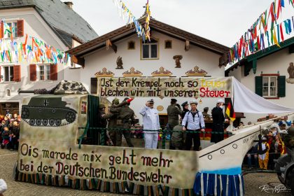 Der Trassenverlauf des Brenner Nordzulaufs entlang des Neubeurer Sees und durch die geliebte Landschaft des Inntals war eines der großen Themen dieses Faschingszuges („Würstel und Eis Valuga am Gleis“), ebenso der marode Zustand bei der Ausstattung der Bundeswehr: „Ois marode nix geht mehr bei der Deutschen Bundeswehr“. Auch der Pflegenotstand war Thema: „Soll die Pflege wieder billig sein, führt ein soziales Prlichtjahr ein!“ Ein weiterer Themenwagen beschäftigte sich mit dem Klimawandel: „Weil der Mensch zu viel Müll und CO2 produziert, der Eisbär seinen Lebensraum verliert.“