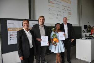 Professor Dr. Reiner Hüttl, Dekan der Fakultät für Informatik (links), mit den Absolventen Dominic Kreuz und Ulriche Ndjiya Tankeu sowie Professor Marcel Tilly.