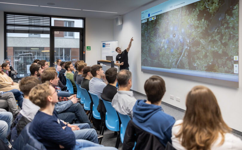 Bericht und Foto: TH Rosenheim – Informatik-Student Albert Zichler präsentierte für sein Team die Ergebnisse des Projekts „SmartCity: Stadtklima messen mit IoT“. Bild: Claus Rammel