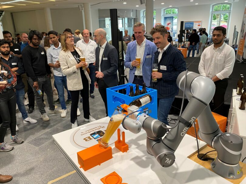 Bildunterschrift: Auch Roboter können ein Weißbier perfekt einschenken, wie Studierende der TH Rosenheim bei einem Projekt am Campus Chiemgau bewiesen.