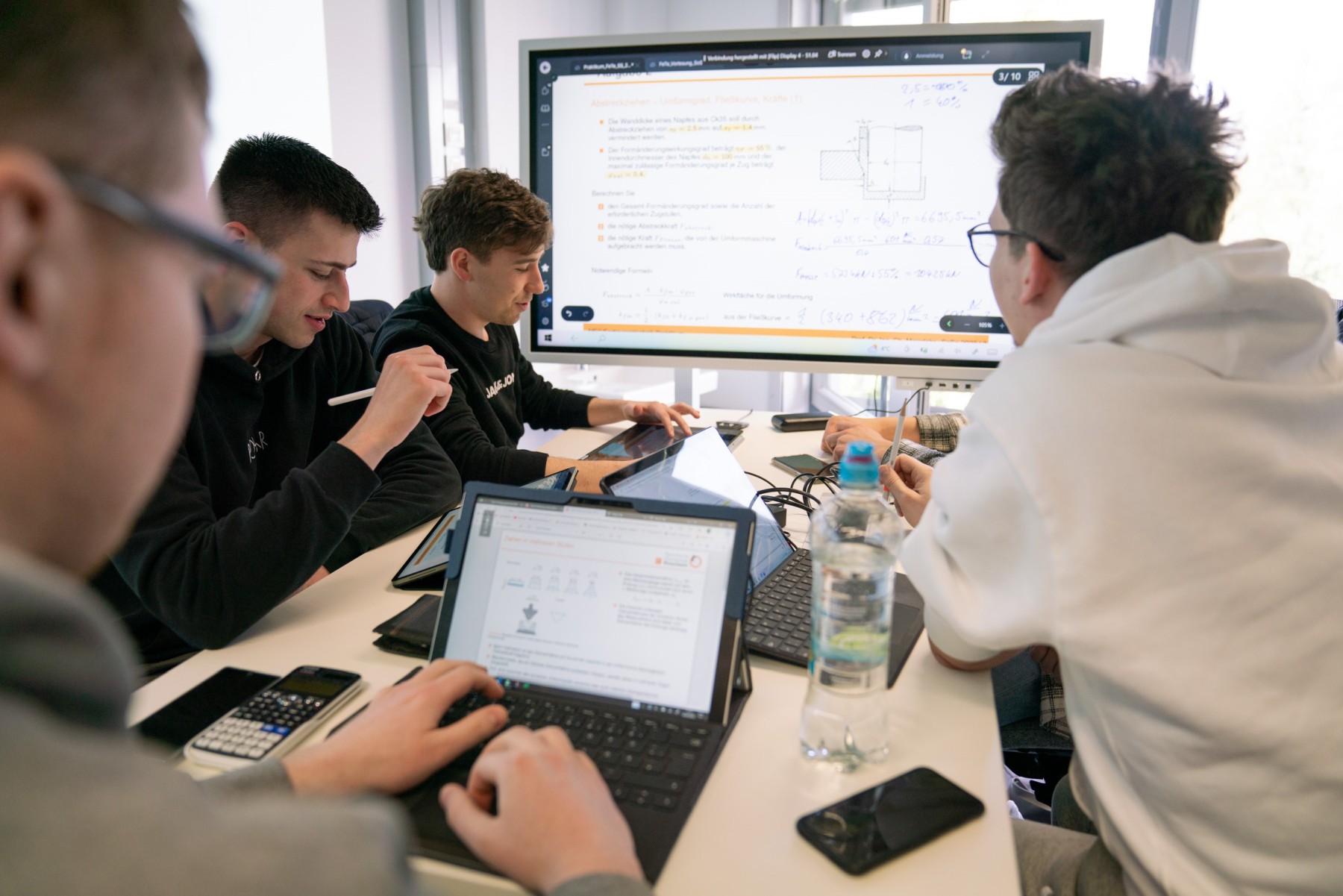 Die Studierenden erarbeiten sich in den Lehrräumen die Lerninhalte gemeinsam mit Kommilitonen, die digital dabei sind – gut sichtbar auf den großen Projektionsflächen im Raum. Alle sind zusammen aktiv auf digitalen Flipcharts: Beispielsweise schreibt eine Studentin im Raum darauf mit einem Spezialstift ihre Ideen, ein online zugeschalteter Student nutzt die Tastatur auf seinem Laptop, um auf derselben digitalen Oberfläche seine Kommentare hinzuzufügen. Mittendrin steht ein Dozent und regt mit Fragen zu weiterem Austausch zwischen den Studierenden an.