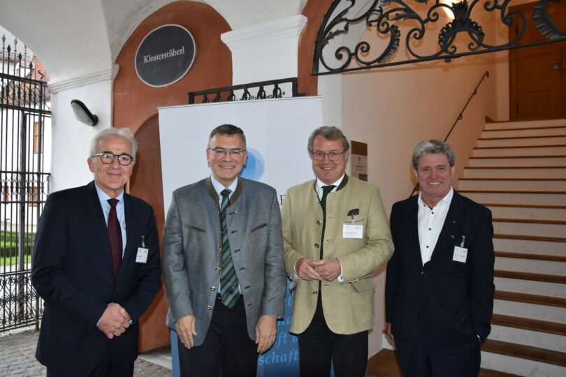 Bildunterschrift: Gerald Rhein, Vorstandsvorsitzender des Seeoner Kreises; Dr. Florian Herrmann, Leiter der Staatskanzlei; MdL Klaus Stöttner, Kuratoriumsvorsitzender der TH Rosenheim; Prof. Heinrich Köster, Präsident der TH Rosenheim (von links).