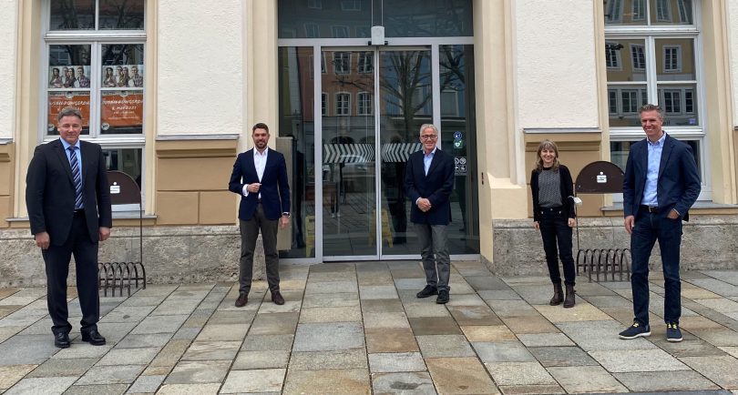 Bildunterschrift: Vor dem Forum Chiemgau in Traunstein, wo die TH Rosenheim vorübergehend untergebracht ist, stehen (von links) TH-Vizepräsident Prof. Dr. Peter Niedermaier, Traunsteins Landrat Siegfried Walch, der Vorstandsvorsitzende des Seeoner Kreises Gerald Rhein, die Geschäftsführerin der Wirtschaftsförderung Traunstein Dr. Birgit Seeholzer und der Standortleiter der TH Rosenheim am Campus Chiemgau Prof. Dr.-Ing. Andreas Straube.