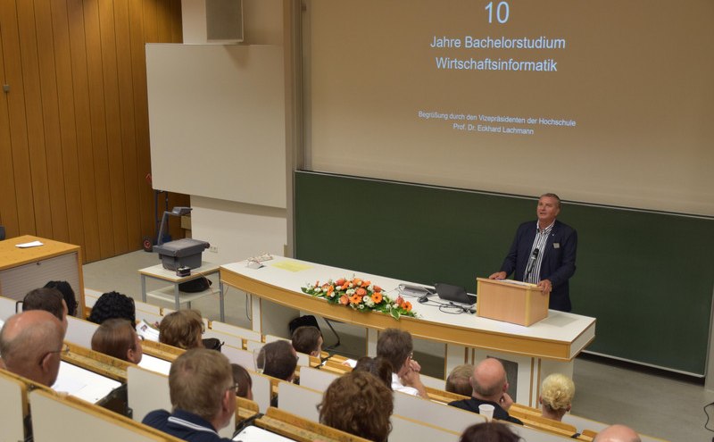 Bildunterschrift: TH-Vizepräsident Prof. Dr. Eckhard Lachmann bei seiner Begrüßungsrede zur 10-Jahresfeier.