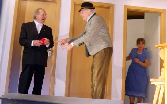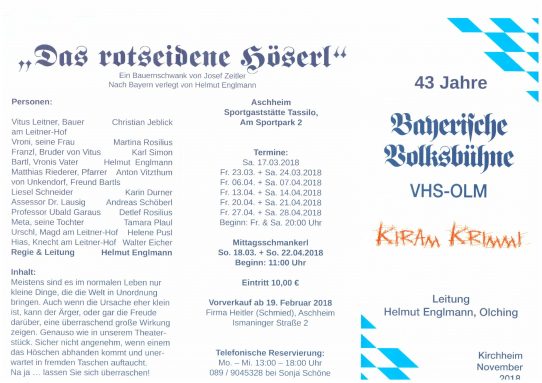 Seit 43 Jahren gibt es eine Bayerische Volksbühne der Volkshochschule im Osten des Landkreises München in Aschheim unter der Leitung von Helmut Englmann aus Olching. Die Aufführungen in der Sportgaststätte Tassilo sind seit Jahren überaus gut besucht, da das Theaterteam unter der Regie & Leitung von Helmut Englmann für Kurzweil und Lacherfolge garantiert. Die heurigen Frühjahrs-Aufführungen mit dem Bauernschwank von Josef Zeitler “Das rotseidene Höserl” mit “Bearbeitung ins Bayerische” durch Helmut Englmann wird noch bis Ende April mehrfach gespielt, unter anderem auch am Sonntag, 22. April als Mittagsschmankerl. Telefonische Reservierungen sind montags bis mittwochs von 13 Uhr bis 18 Uhr bei Sonja Schöne, Tel. 089-9045328 möglich.
