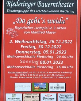 Die Theatergruppe des Trachtenvereins Riedering spielt an 4 Terminen im Dezember und Januar das bayerische Lustspiel “Do geht’s weida” von Manfred Mayer. Die Premiere findet am 2. Weihnachtsfeiertag, 26. Dezember 2022, um 20 Uhr in der Mehrzweckhalle Riedering statt. Die weiteren Termine lauten: