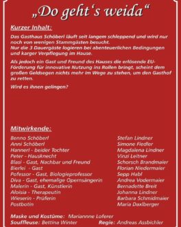 Inhalt: Das Gasthaus Schöberl läuft seit langem schleppend und wird nur noch von wenigen Stammgästen besucht. Nur die 3 Dauergäste logieren bei abenteuerlichen Bedingungen und karger Verpflegung im Hause. Als jedoch ein Gast und Freund des Hauses die erlösende EU-Förderung für innovative Nutzung ins Rollen bringt, scheint dem großen Geldsegen nichts mehr im Wege zu stehen, um den Gasthof zu retten. Wird es ihnnen gelingen?