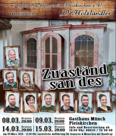 Die Laienspielgruppe des Trachtenvereins “D’Holzlandler” Pleiskirchen im Landkreis Altötting führt an den kommenden Wochenenden das Theaterstück “Zuaständ san des!“, eine Komödie in drei Akten von Fred Bosch, im Gasthaus Münch auf.