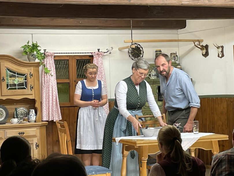 Vor und nach dem Stück erklang auf der Bühne am Samstag die Theatermusik von „K 4“ und am Sonntag von „Fast nur Blech“. Bei den Aufführungen am kommenden Wochenende sind am Freitag um 20.00 Uhr „Knöpf und Blech“, am Samstag um 20.00 Uhr die „Ramsauer 6er Musi“, am Sonntag, 14.00 Uhr die „Hinum-Herum Musi und am Sonntag um 20.00 Uhr die „Reischamer Ziachmusi“ zu hören. Die Gäste im zweimal voll besetzten Saal wurden von der Bewirtungsmannschaft des Trachtenvereins bestens bedient. Beeindruckt sind die Besucher auch von der adventlichen Dekoration des Gutsgasthofs.