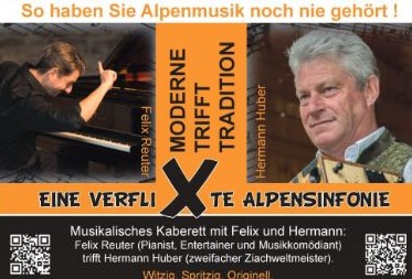 Was soll schon Schlimmes passieren, wenn sich zwei Vollblutmusiker im tiefsten Oberbayern, in den herrlichen Alpen, zufällig treffen und ein Stück des Weges gemeinsam wandern – wenn es sich nicht um den Thüringer Musikkomödianten und Pianisten Felix Reuter und den Zweifachweltmeister auf seiner Ziach, Hermann Huber aus Oberbayern handeln würde! In ihrem neuen Kabarettprogramm erzählen beide die witzigsten und besten Begegnungen, die sie auf ihrer Wanderung erlebt haben. Den Enzian kann man beispielsweise trinken oder musizieren, eine Forelle nicht nur essen, sondern die von Franz Schubert auch aufführen. Einem Schwan kann man von Peter Tschaikowsky lauschen – oder eben füttern. Über Phänomene der Natur wurde sehr häufig komponiert: Wie entstand die Melodie der Kleinen Nachtmusik von Mozart wirklich? Es ist desaströs und erstaunlich zugleich, wie viele Komponisten doch voneinander abgeschrieben haben. Dieses alles findet eine nicht immer ernstgemeinte Aufklärung! Zum Glück hat Hermann Huber neben seiner Ziach auch seine Klarinette dabei…
