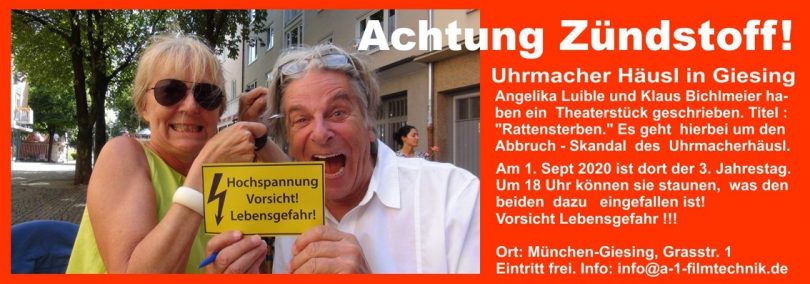In München-Giesing gibt es seit ein paar Jahren einen Abbruch-Skandal um das Uhrmacher-Häusl. Am 1. September ist an Ort und Stelle, Grasstraße 1, um 18 Uhr das Theaterstück “Rattensterben” zu sehen, an das sich Angelika Luible udn der Filmregisseuer Klaus Bichlmeier herangewagt haben. Der Eintritt ist frei.