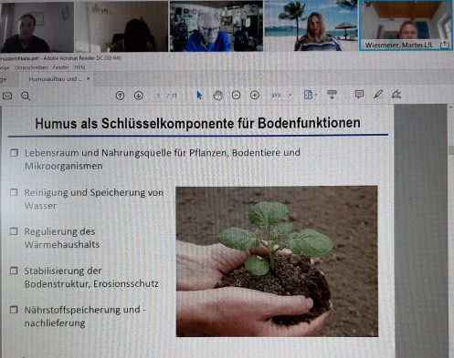 Kürzlich trafen sich – virtuell – die „Arbeitsgruppe Humusaufbau“, bestehend aus Vertretern der Arbeitsgemeinschaft für Ernährung, Landwirtschaft und Forsten (ELF) Oberbayern, Öko Arbeitskreis Oberbayern des Bayerischen Bauernverbandes (BBV) und der Bauern & Land Stiftung (BLS) mit Herrn Sedlmayer und Prof. Dr. Wiesmeier von der Landesanstalt für Landwirtschaft (LfL) zum Thema Humusaufbau / CO2 Speicherung im Bereich regenerativer / aufbauender Methoden. – Besprochen wurden die bis Dato gelaufenen Versuche und Methoden der LfL in diesem Bereich, sowie die Überlegung der Arbeitsgruppe, ein längerfristiges Projekt in diesem Sektor zu starten. Weitere Gespräche zur Entwicklung eines Projektes im Bereich Förderung des Humusaufbaus sind geplant. Die beteiligten Personen Rupert Staudhammer und Michael Hamburger von der ELF, Ralf Huber und Michael Popp vom BBV und Anja Eckmüller von der BLS werden eine Versuchsbeschreibung ausarbeiten. Die Praktiker würden dabei ihre Erfahrungen aus der Landwirtschaft mit einbringen. Zusammen mit der umfassenden wissenschaftlichen Expertise von Prof. Dr. Wiesmeier hat das Vorhaben das Potential, zu sehr guten Lösungen für die Agrarwirtschaft zu führen. Somit würde ein Projekt von Praktikern für Praktiker mit fundierten wissenschaftlichen Methoden dokumentiert werden können und eine Langzeitbeobachtung mit aktuellen Veröffentlichungen zu den Fortschritten es Projektes von Seiten der Arbeitsgruppe Humusaufbau begleitet werden. LfL-Chef Sedlmayer begrüßte die Aktivitäten zum Humusaufbau seitens der Landwirtschaft in Oberbayern.
