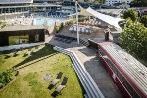 Der renovierte Außenbereich der Altmühltherme Treuchtlingen lockt Gäste nach draußen © Peter von Felbert